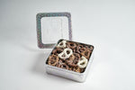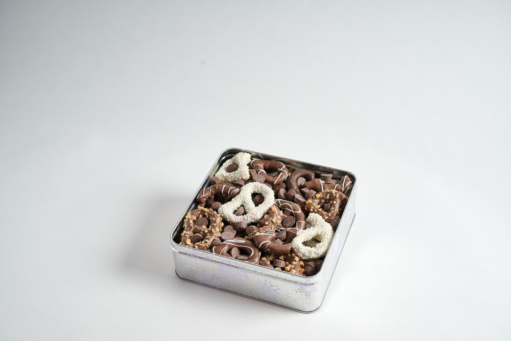 A holiday treat for all! This festive Snowflake Tin is filled with nearly two pounds of irresistible assorted pretzel bites. Each crunchy bite is coated in dark, milk, or white chocolate and sprinkled with a delightful mix of toffee bits, nonpareils, mini caramel cups, mini peanut butter cups, and white chocolate gems — the perfect blend of sweet, salty, and holiday cheer.