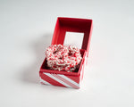 This adorable holiday gift box features four (4) hand-dipped white chocolate-covered pretzels, generously topped with cool, minty crushed candy cane bits.