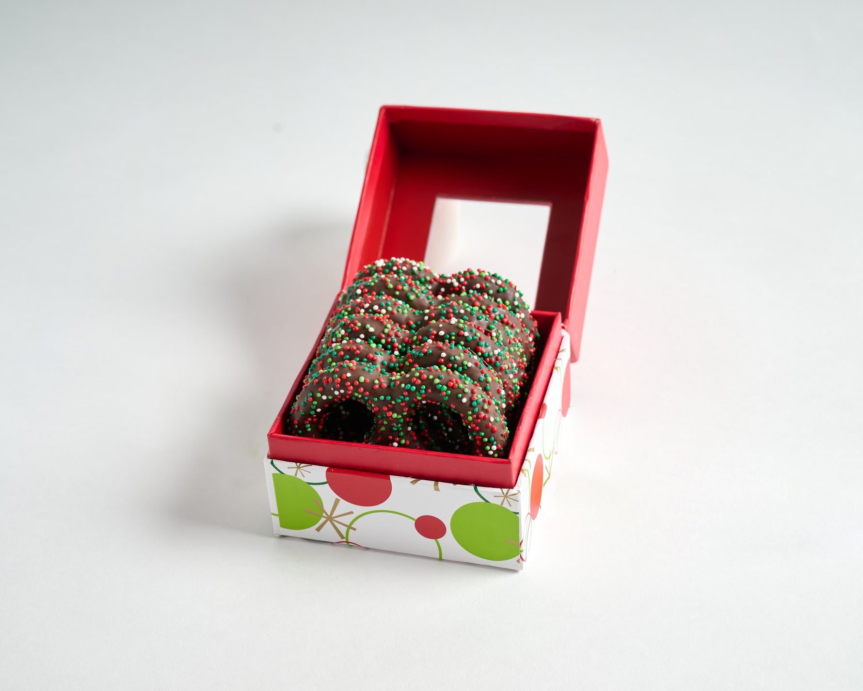 Our festive petite Holly Jolly Gift Box is sure to spread holiday cheer! Inside, you’ll find six (6) joyful, hand-dipped chocolate-covered pretzels in creamy milk chocolate, each sprinkled with Christmas themed nonpareils.